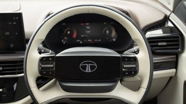 In Tata Safari 2025 , you get 4 spoke design power steering which is leather wrapped and loaded with many features. Many cruise control buttons are mounted on this steering. It makes your driving experience easy. And in the middle there is a backlit Tata logo which gives a different look to the interior of the car.